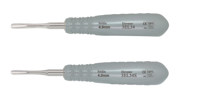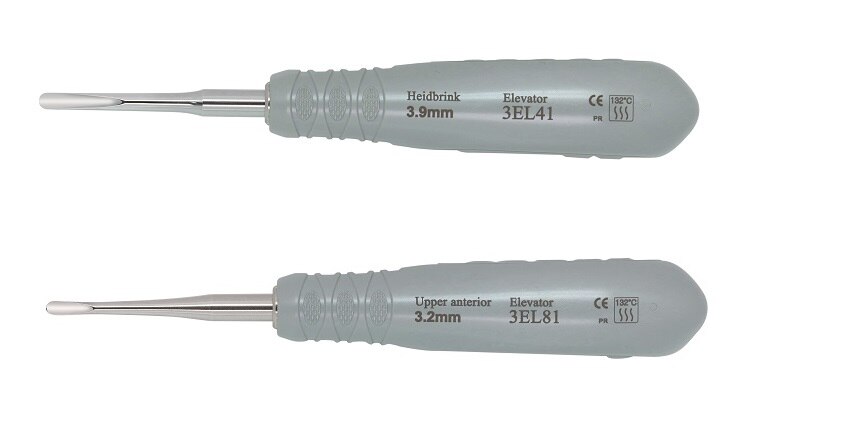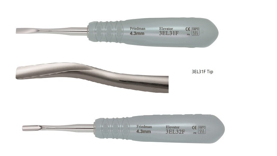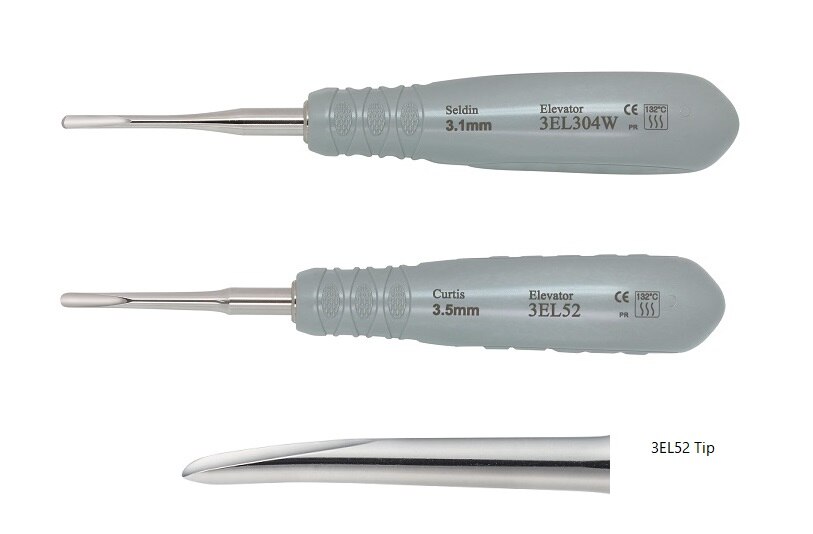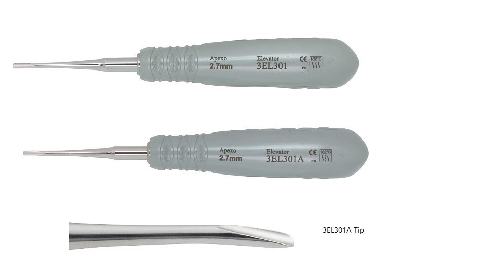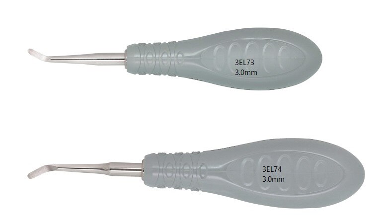 •Used for loosening the tooth from the periodontal ligament and making the extraction easy. Available in Metal, Plastic & Aluminum Handle 3EL34 3EL34S 4.9mm 4.0mm Upper & Lower Anterior Roots Upper & Lower Anterior Roots 3EL31F 3EL32F 4.3mm 4.3mm Upper & Lower Cuspids Upper & Lower Cuspids 3EL41 3EL81 3.9mm 3.2mm Upper & Lower Anterior Upper Anterior apices and teeth & roots small teeth 3EL301 3EL301A 2.7mm 2.7mm Deeply seated roots Deeply seated roots 3EL304W 3EL52 3.1mm 3.5mm Deeply seated roots Curved Backward 3rd Molar 3EL4 3EL5 3.0mm 3.0mm Broken or Deeply seated roots Broken or Deeply seated roots 3EL73 3EL74 3.0mm 3.0mm Broken or Deeply seated roots Broken or Deeply seated roots