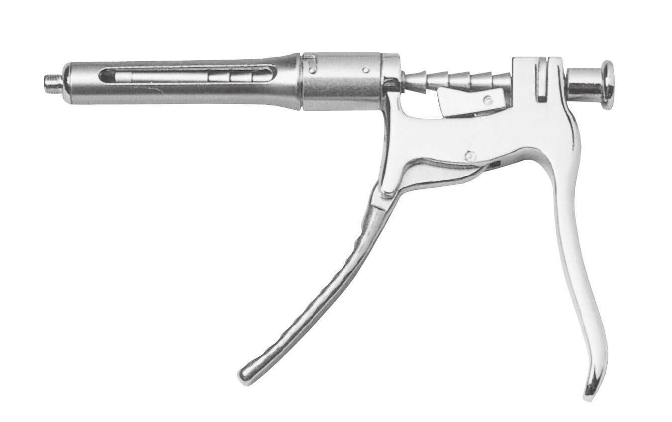 •Designed to incorporate a leverage factor which enables the syringe to develop the high injection pressure, required for intrafilamentary anesthesia with less energy. One complete squeeze of the trigger releases one dose(0.2cc), which is sufficient to anesthetize a single Video root tooth for 30 minutes to one hour.