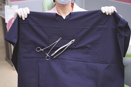 Surgical Drape •A magnet is inserted into drape to stick hinge-typed dental instruments such as scissors, needle holders, and so on. •Magnet can be removed. •Size : 900 x 900mm •Hole diametar : 90mm Towel Clamp CPTC135 •Length 135mm(±5mm)