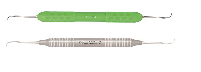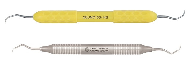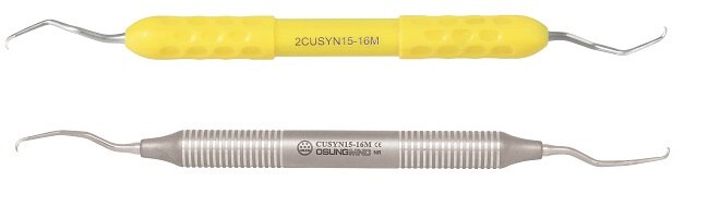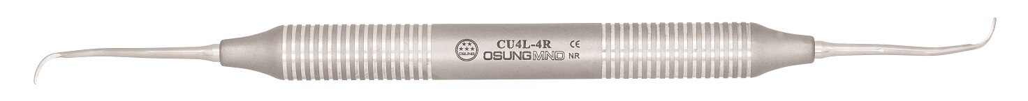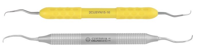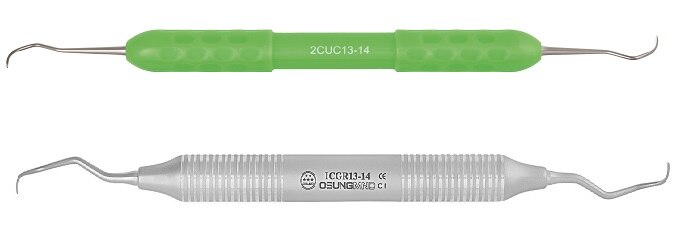 Blades are sharpened on both sides. Blade curved at 90 degrees to the shank with a rounded toe. Designed so that the working ends can be adapted to all tooth surfaces of all regions of the mouth with one double-ended instrument. CUC13-14 •Used for removal of minor calculus of all teeth. •For both mesial and distal surfaces. CU2L-2R •Used for removal of minor calculus of incisors and premolars. •For supra- and subgingival. CU4L-4R •Used for removal of minor calculus of incisors and premolars. •For supra- and subgingival CUMC13S-14S •Rigid shank with strong blade is suitable for removal of heavy calculus deposits. •For removal of supra- and subgingival calculus CUSYN15-16 •A combination of universal and finishing curette for the removal of supra- and subgingival calculus. •For both concave and convex surfaces. CUSYN15-16M •Excellent in tight, deep pocket